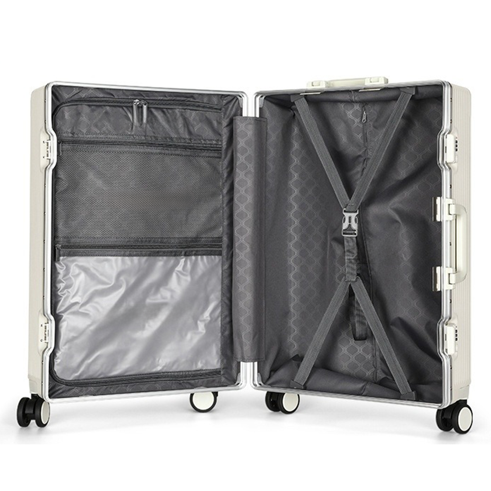We combine the 100% polycarbonate shell with an aluminum zipper border to create a rigid suitcase body that can sustain 250 lbs of weight with little deformation.