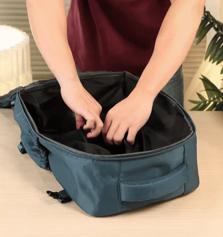 Our carry-on backpack features a unique dual-mode design. You can simply press the pouch to activate the vacuum seal mode—thanks to the one-way air valve, air escapes to compress and protect your belongings. Prefer more space? Use it in its regular mode with our portable mini vacuum.